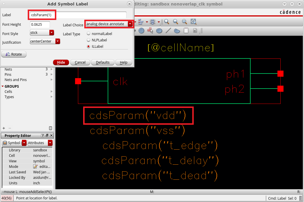 Displaying Verilog-A model parameters on the schematic can be useful to track changes. To do that, all you need is to add text label (Create → Label [Hotkey L]) and then press F3 to display options menu: