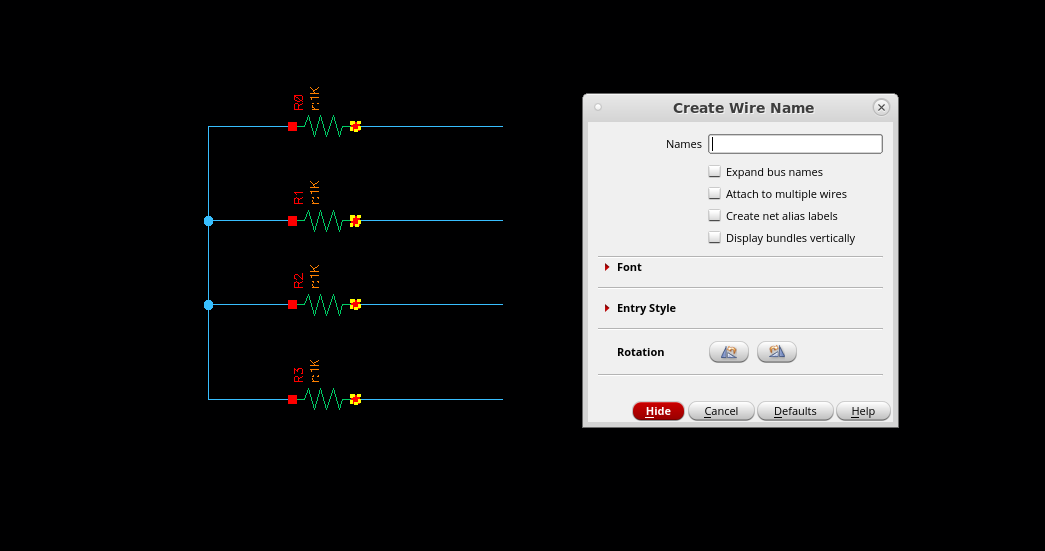 - Then, create a bus name and add an index, according to the number of nets (in this example we have 4 nets so the net index is <0:3> or <1:4>) and select options Expand Bus Names and Attach to Multiple Wires:
