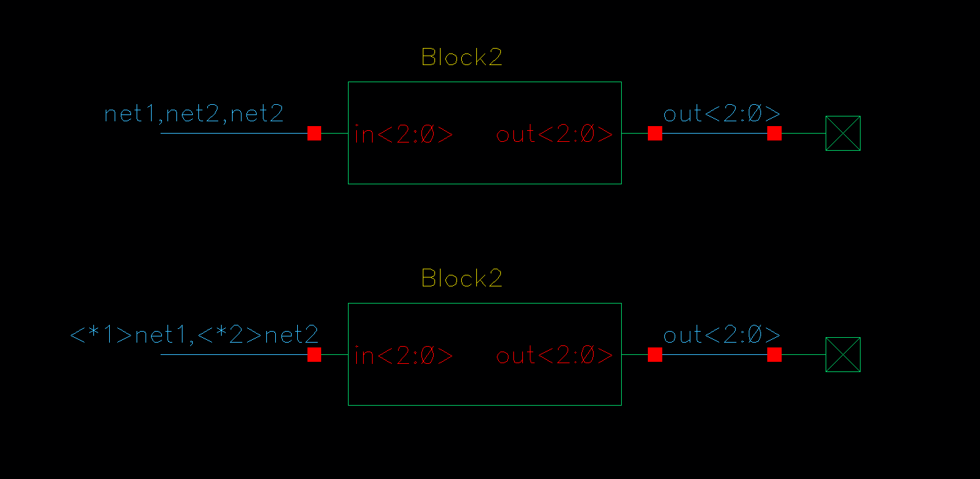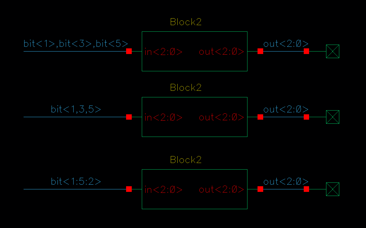 Sometimes we need to connect a multiple separate nets to a bus. Let's say, we have a block input of <2:0> and we want to connect bits <1>, <3>, <5> to this input. In order to do that, we can write bit<1>, bit<3>, bit<5> on the input net. However, the simplier way of doing that is writing bit<1,3,5>: