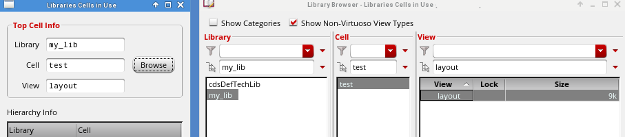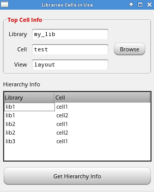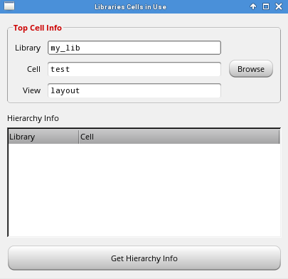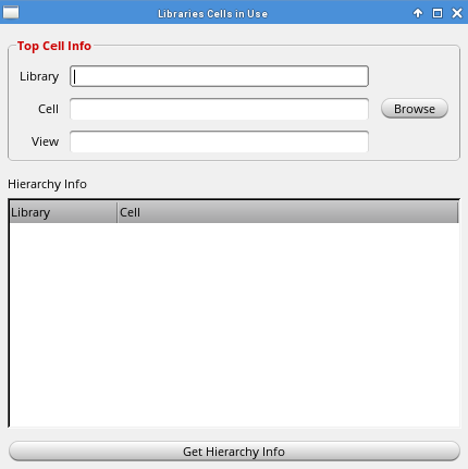 Start by building a GUI template. Our GUI will receive the top cell's library, cell, and view names as input and display library and cell names used in the top cell's hierarchy.
